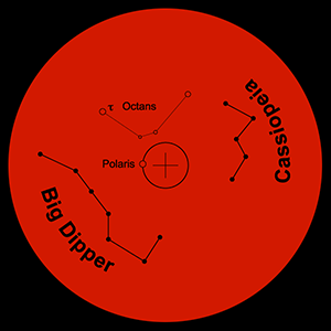 Usando solo le regolazioni di altezza ed azimut centrare la stella Polare all'interno del piccolo cerchio come si vede nell'immagine e la montatura sarà allineata correttamente al polo. |