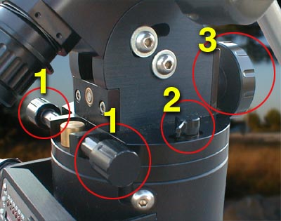 Iniziate con l'identificare i comandi sulla montatura. I comandi si trovano tutti alla base della testa equatoriale.