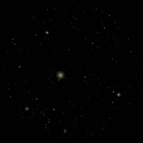 A questo punto disponete la montatura sul terreno in modo che l'asse di ascensione retta, quello che contiene il cannocchiale polare, punti in direzione di Polaris. Livellate la montatura usando come riferimento le due bolle inserite alla base della GM-8 proprio a questo scopo. Ruotate l'asse di declinazione in modo da non ostruire il cannocchiale polare, quindi osservateci dentro ed usate le manopole di regolazione di altezza ed azimuth per portare la stella polare più o meno al centro del campo. Noterete nel cannocchiale polare che attorno a Polaris ci sono altre tre stelle abbastanza luminose.