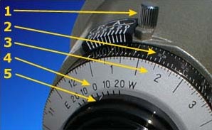 Ora bisogna ruotare la ghiera di Ascensione Retta 2 finché non indica 0, quindi va bloccata con la vite 1. Ruotare a questo punto la ghiera 3 finché la scala 4 non indica sulla tacca 5 lo spostamento in gradi tra la longitudine della località d'osservazione ed il meridiano centrale del fuso orario locale. Ad esempio il meridiano centrale del fuso orario in uso in Italia è posto a 15°. Se mi trovo ad Roma (la cui longitudine è 12° 30') sono ad Ovest di due gradi e mezzo rispetto al meridiano centrale del fuso orario, quindi sposterò la ghiera 3 finché la tacca 5 non indicherà, sulla scala 4, 2.5° verso W. A questo punto bisogna guardare il proprio orologio per conoscere la data e l'ora locale e ruotare l'asse dell'Ascensione Retta della montatura (NON la ghiera 2) in modo da fare coincidere la data locale sulla scala 3 con l'ora locale sulla scala 2 (ricordando di sottrarre un'ora se è in vigora l'ora legale estiva). NB: i numeri indicati sulla scala 3 indicano i mesi dell'anno, ed ogni tacca indica all'incirca due giorni. Per esempio nella foto qui sopra le ghiere sono impostate per le ore 23:00 del 12 Febbraio.