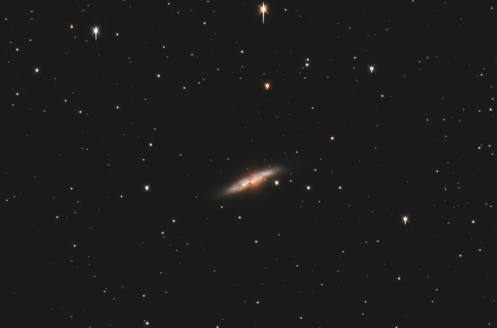 Charles Messier descrisse questa galassia come un oggetto nebuloso e irrisolvibile in stelle, vicina a M81 e dalla forma molto allungata; fu osservata anche da Johann Elert Bode nel 1774 e da Pierre Méchain nel 1779. In seguito fu riosservata da John Herschel, che la descrisse come una sorta di "raggio" luminoso dalla composizione che però non poteva conoscere. Lord Rosse rimase colpito da quest'oggetto, descrivendolo in termini entusiastici come una nube percorsa da diverse bande oscure; verso la fine dell'Ottocento fu fotografato per la prima volta e fu descritto come un oggetto visto di taglio. M82 subisce gli effetti gravitazionali della sua galassia vicina, la più grande M81; queste forze mareali hanno deformato M82 fin da circa 100 milioni di anni fa. Queste interazioni hanno causato un forte aumento dei fenomeni di formazione stellare. Nelle regioni centrali di M82 l'area di starburst attiva si estende con un diametro di 500 parsec; otticamente, ci sono quattro regioni di elevata luminosità superficiale, catalogate come A, C, D ed E. Queste regioni corrispondono a ben note sorgenti di raggi X, infrarossi e onde radio; di conseguenza, si crede che siano degli ammassi di starburst oscurati sulla nostra linea di vista. È presente un getto bipolare (o supervento), concentrato sulla regione A e C e rifornito dall'energia emessa da esplosioni di supernova, che avvengono mediamente una volta ogni dieci anni. L'Osservatorio a raggi X Chandra ha rilevato emissioni di raggi X dalla galassia, a circa 600 anni luce di distanza dal suo centro. Alcuni astronomi hanno ipotizzato che M82 contenga il primo buco nero di massa intermedia, circa 200-5000 masse solari, invece dei buchi neri supermassicci comunemente ipotizzati al centro delle galassie, la cui massa si aggira sui 30 milioni di masse solari. Si è per lungo tempo creduto che M82 fosse una galassia di forma irregolare; tuttavia, nel corso del 2005 sono stati scoperti due bracci di spirale simmetrici, ben visibili nelle immagini all'infrarosso della galassia. Questi bracci si originano dalle estremità di una barra centrale, visibile sempre agli infrarossi; sebbene questi bracci siano visibili agli infrarossi, il loro colore naturale è maggiormente blu rispetto al disco, a causa della presenza di molte stelle giovani. Assumendo che la parte settentrionale della galassia sia più vicina a noi, come si spiega in letteratura, il senso di rotazione osservato implica la presenza di bracci trainanti. A causa dell'elevata luminosità superficiale del disco, posto quasi di taglio rispetto alla nostra linea di vista (circa 80°) e della presenza di una complessa rete di filamenti oscuri di polveri visibili nelle immagini ottiche, i bracci di spirale non sono stati mai osservati in precedenza. M82 è la galassia più grande del Gruppo di M81, un gruppo che conta 34 galassie situate nella costellazione dell'Orsa Maggiore; la distanza media di questo gruppo è di circa 11,7 milioni di anni luce, pari a 3,6 milioni di parsec, rendendolo così uno dei gruppi di galassie più vicini al nostro Gruppo Locale. M82 come detto è in interazione con la vicina Galassia di Bode (M81) e NGC 3077; questa interazione ha strappato via alle tre galassie una discreta quantità di gas idrogeno, che ora forma delle strutture a filamenti che collegano le tre galassie. Inoltre, hanno anche causato la caduta di parte di questo gas sulla Galassia Sigaro e di NGC 3077, causando una grande attività di formazione stellare nei centri di queste due galassie.