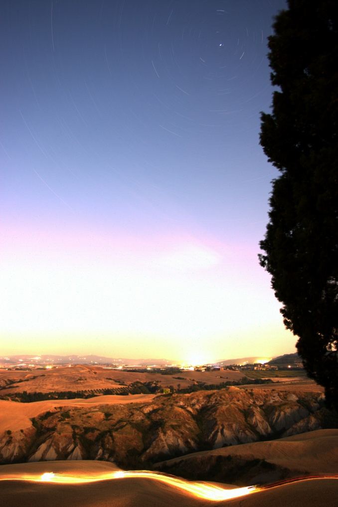 Questa immagine da un'idea di cosa si intenda per "inquinamento luminoso". Un'ora di esposizione con la Canon EOS 300D fissata su un comune cavalletto fotografico mostra, alle 23:20 e quindi in piena notte, un cielo che nella parte bassa è addirittura abbagliante. Le stelle cominciano a scorgersi solo a circa 30° di altezza, e comunque solo quelle più luminose. L'immagine non è stata ripresa da una grande città, ma in aperta campagna, dal Podere Finerri nel comune di Asciano, in provincia di Siena. Una curiosità: le scie luminose sui campi di grano nella parte bassa dell'immagine sono state lasciate dai fari di una trebbiatrice che svolgeva il suo lavoro.