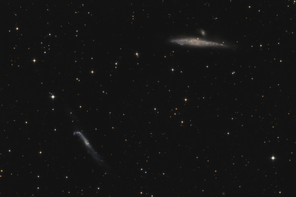 NGC 4631, in alto a destra, è una galassia a spirale posta di taglio rispetto al nostro punto di vista e per la sua forma è conosciuta come Galassia Balena (Whale Galaxy) o più raramente Galassia Aringa (Herring Galaxy). Posta a circa 25 milioni di anni luce da noi nella costellazione dei Cani da Caccia si trova accanto alla galassia ellittica NGC 4627. NGC 4656, più in basso sulla sinistra, è una galassia a spirale la cui forma è resa contorta ed irregolare dall'interazione gravitazionale con un'altra galassia, NGC 4657. Assieme sono conosciute con il nome di "Galassie Bastone da Hockey" e si trovano a circa 10 milioni di anni luce da noi, nella costellazione dei Cani da Caccia.