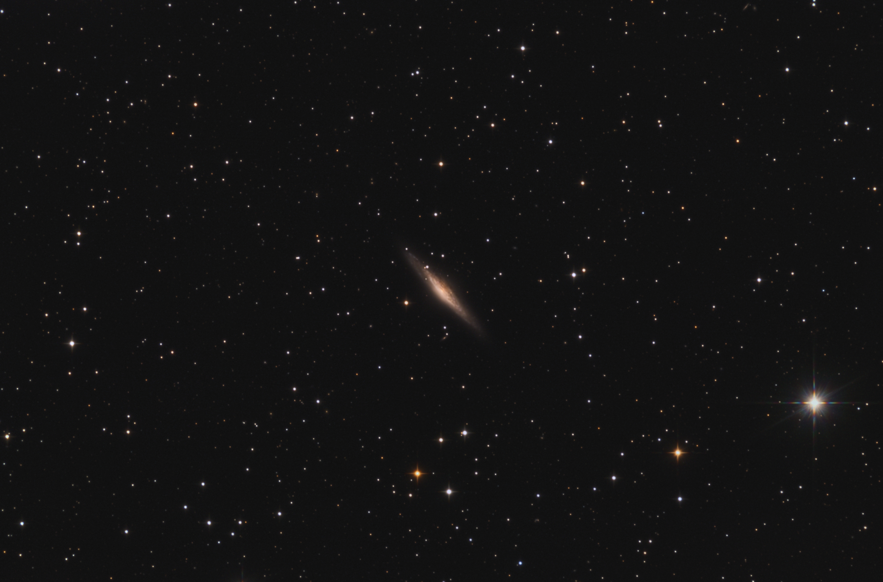 La "Galassia UFO" NGC 2683 fù scoperta il 5 febbraio 1788 da William Herschel. Si trova tra i 16 ed i 25 milioni di anni luce dalla nostra galassia. NGC 2683 è posta quasi di taglio e la parte giallastra visibile sul suo disco sono le polveri che si trovano sul piano galattico.