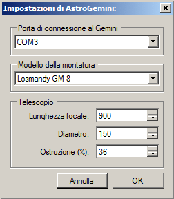 Questa è la finestra principale di AstroGemini attraverso la quale potrete controllare la vostra montatura. Questa finestra può essere ridotta ad icona se non la volete avere sullo schermo e volete usare AstroGemini solo come driver ASCOM. Se invece chiudete la finestra o comunque uscite dal programma o interrompete la connessione al Gemini il driver ASCOM di AstroGemini non potrà più funzionare. La prima cosa da fare è regolare alcune impostazioni. Scegliete la voce Impostazioni... dal menù File in modo da far apparire una finestra simile a questa: