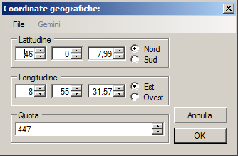 Scegliete la porta seriale attraverso la quale avete collegato il vostro PC al Gemini. Se usate un adattatore USB/Seriale (come ormai fanno quasi tutti visto che le porte seriali sui moderni PC sono diventate rare) vi consiglio di inserire sempre lo stesso adattatore nella stessa presa USB evitando così che ogni volta il numero di porta COM cambi. Un'altra cosa da scegliere è il modello di montatura su cui il vostro Gemini è installato. I dati del vostro telescopio non sono indispensabili ad AstroGemini ma verranno inviati ai programmi che ne faranno richiesta attraverso la piattaforma ASCOM: ad esempio MaxIm DL utilizza questi dati per alcune operazioni. Insomma per la fatica che costa vi consiglio di riempire anche questi campi. Una volta compilati tutti i campi confermate le vostre modifiche con il tasto OK. AstroGemini ricorderà queste impostazioni tra una sessione e l'altra e quindi se non cambiate qualcosa non sarà necessario regolarle di nuovo. Un'altra cosa da fare è inserire in AstroGemini la vostra posizione geografica. Questa operazione la potete effettuare sia quando Gemini non è connesso che quando è connesso. Scegliete la voce Coordinate geografiche... dal menù File per far apparire una finestra simile a questa:
