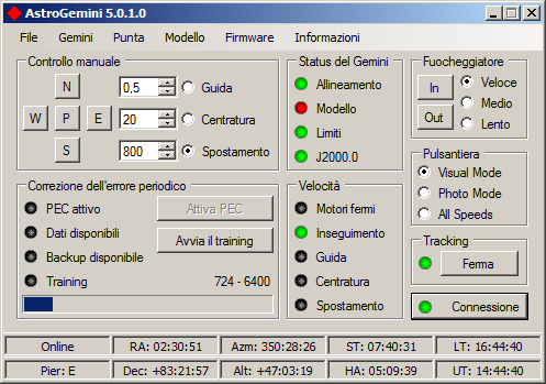 Una volta effettuate le impostazioni è possibile effettuare la connessione al Gemini. Per farlo potete usare la voce Connessione dal menù Gemini o più semplicemente potete fare un click sul pulsante Connessione. Quando la connessione è interrotta il pulsante Connessione ha un indicatore rosso, che diventa giallo se la connessione è attiva ma il Gemini non è pronto. Quando il Gemini è connesso e pronto l'indicatore passa a verde. Se l'indicatore di connessione è giallo e nella barra di status appare la scritta "Offline" le cause possono essere molteplici, ma di solito si tratta di una di queste:
